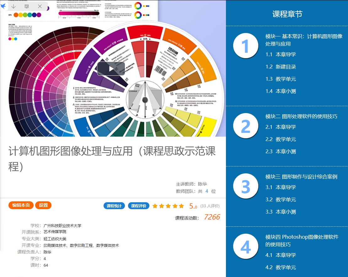 本课程全面贯彻党的教育方针,落实立德树人为根本任务,以课程思政为抓手,以在线课程为载体,强化学生人文社会科学素养、社会责任、能够在课程学习中理解并遵守职业道德和规范,履行职责,具有探索精神和创新意识。通过本课程教学,使学生掌握图形图像软件及相关辅助设备基本操作,重点掌握图形图像软件的选区与填色、绘画与图像修饰、调色、抠图、蒙版与合成、...