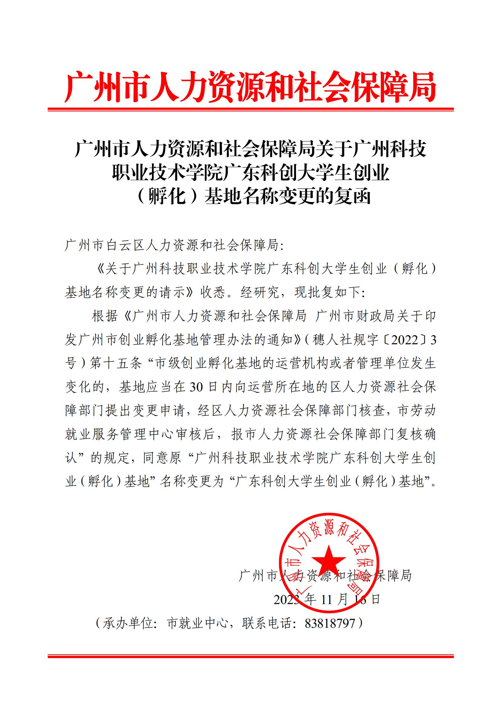 关于广州科技职业技术学院广东科创大学生创业(孵化)基地名称变更的通知