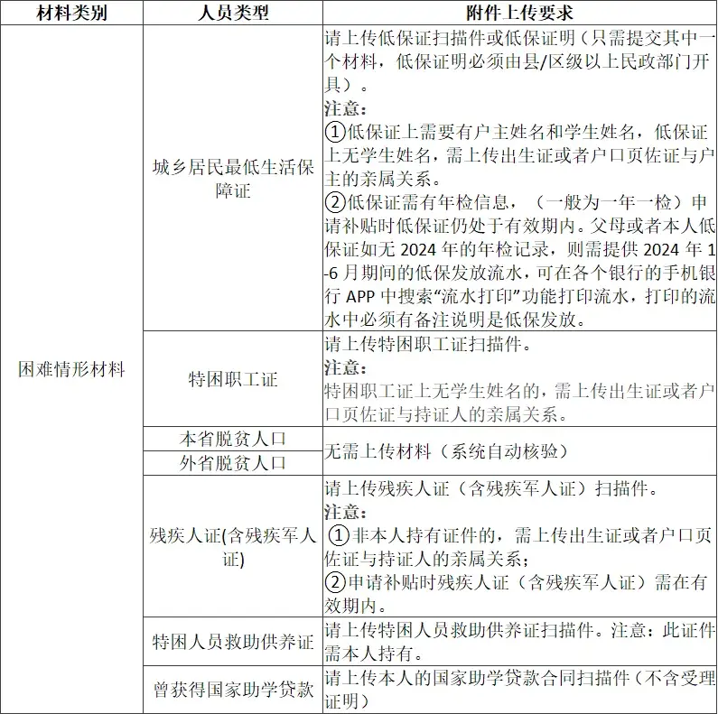 学生父母一方持有且在有效期内并由县(区)级或以上相关政府部门出具的以下其中一项材料:城乡低保证/残疾人证/残疾军人证/特困职工证(需在系统上传证件原件扫描件)。若属于脱贫人口家庭,学生无需上传困难情形证明材料。