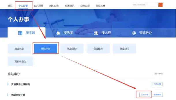 (1)进入“个人办事”界面,找到“补贴申办”-“求职创业补贴”,点击“立即办理”。