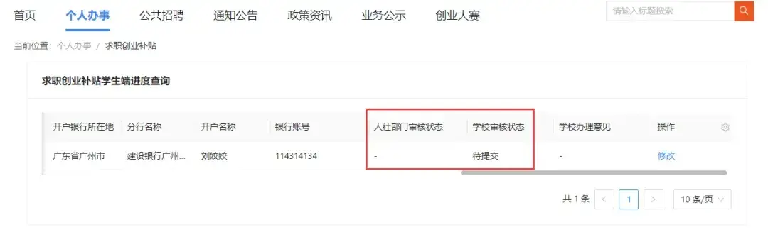 1.学生保存或提交申请后,进入“个人办事”界面,找到“补贴申办”-“求职创业补贴”,点击“进度查询”。