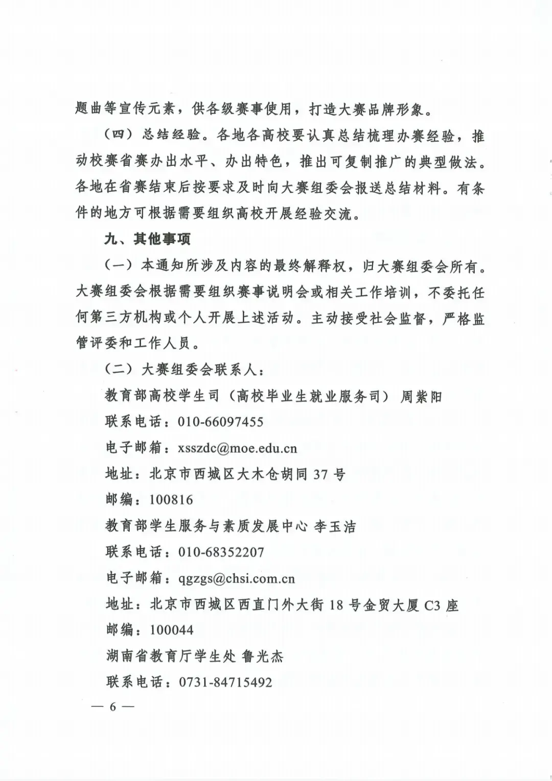 (二)校赛由各高校负责组织,省赛由各地负责组织。各地各高校参照大赛成长、就业赛道方案,自主确定参赛名额、分组设置、比赛环节、评审方式和奖项设置等。各地完成省赛选拔后,择优推荐全国总决赛参赛选手(本科生、研究生、专科生须保持合适比例)。