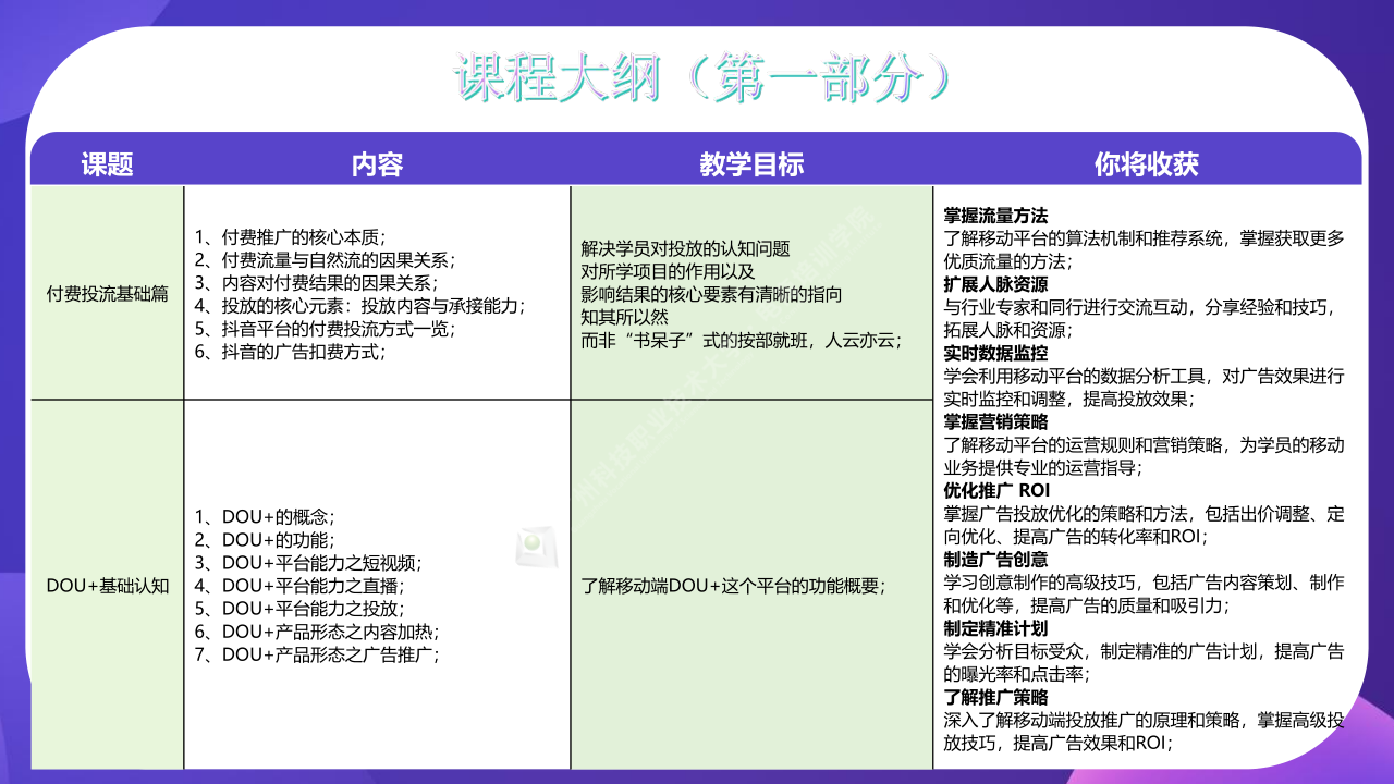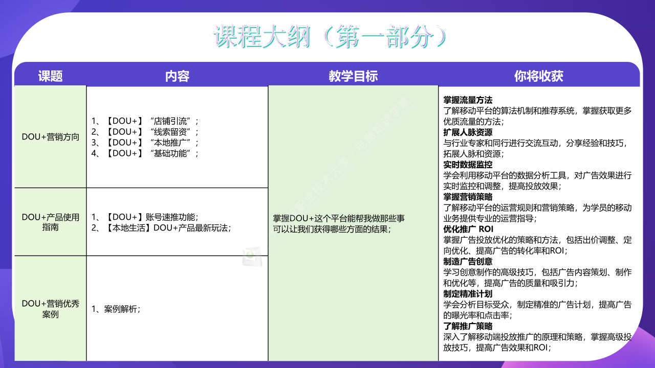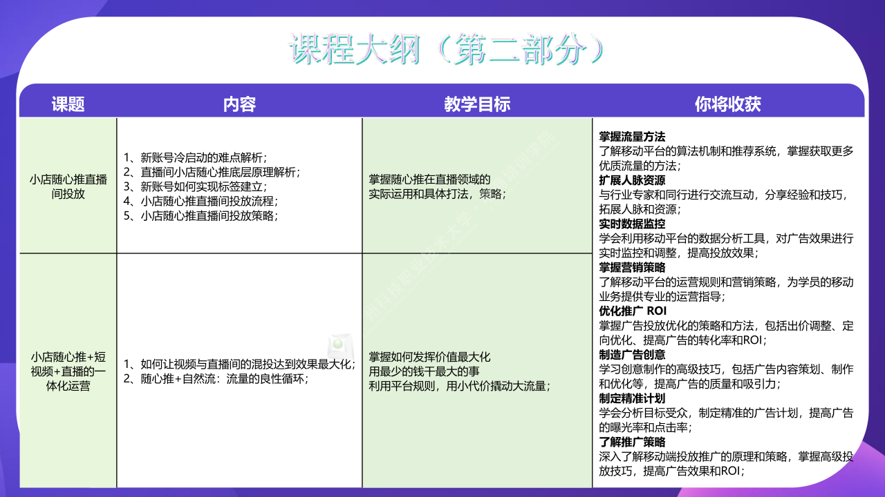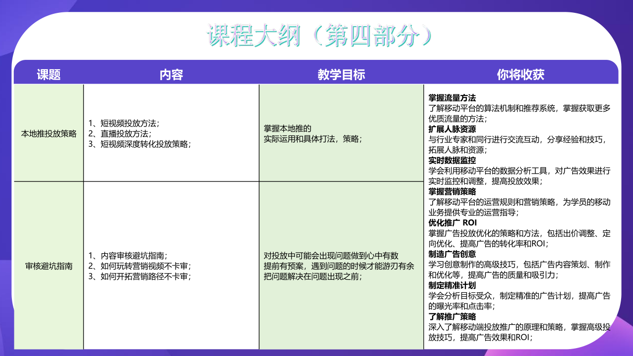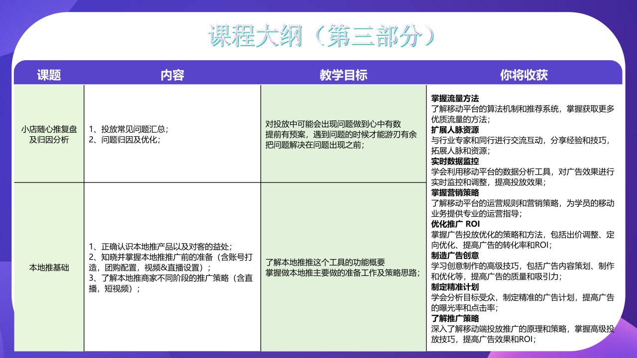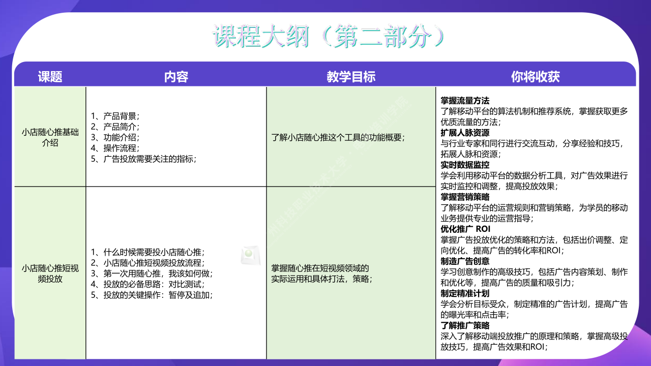 了解移动平台的运营规则和营销策略,为学员的移动业务提供专业的运营指导