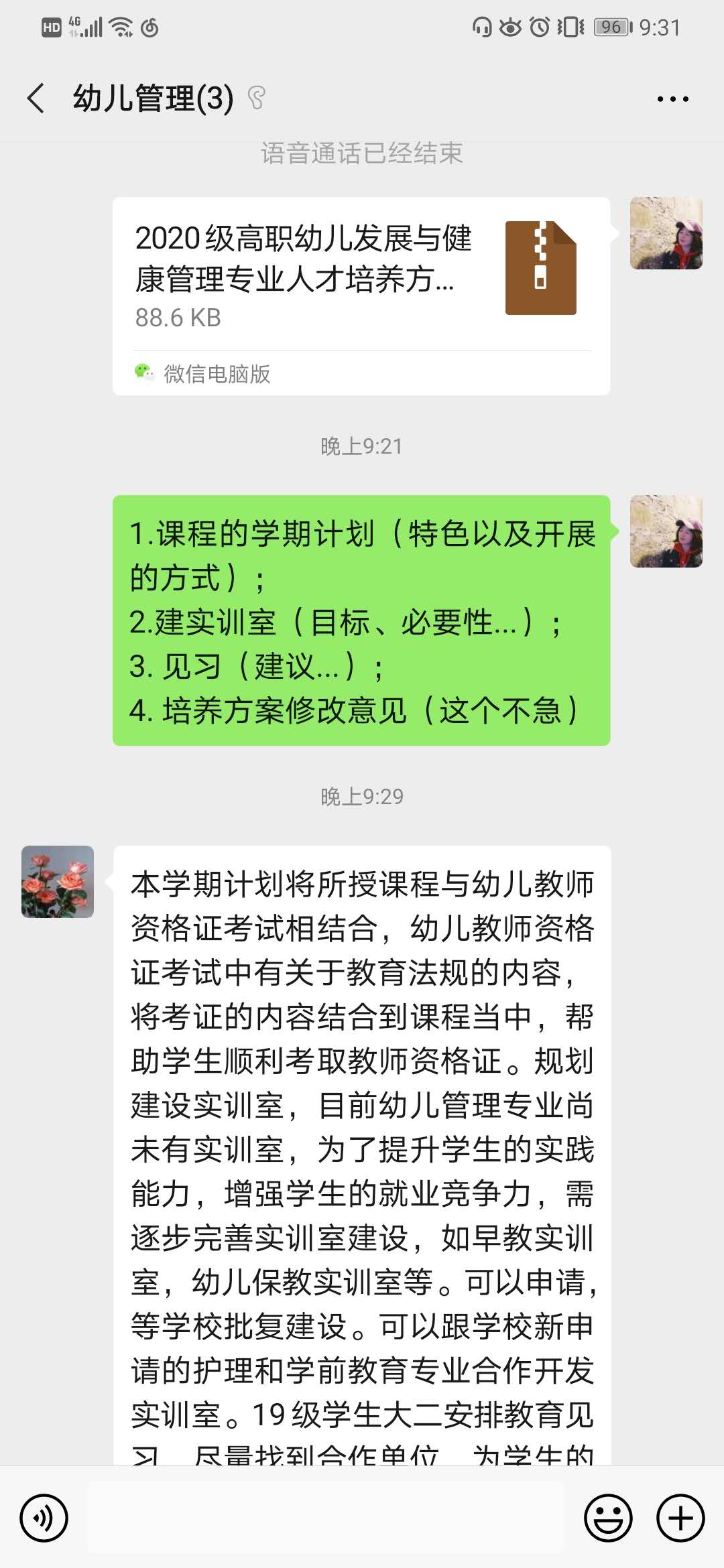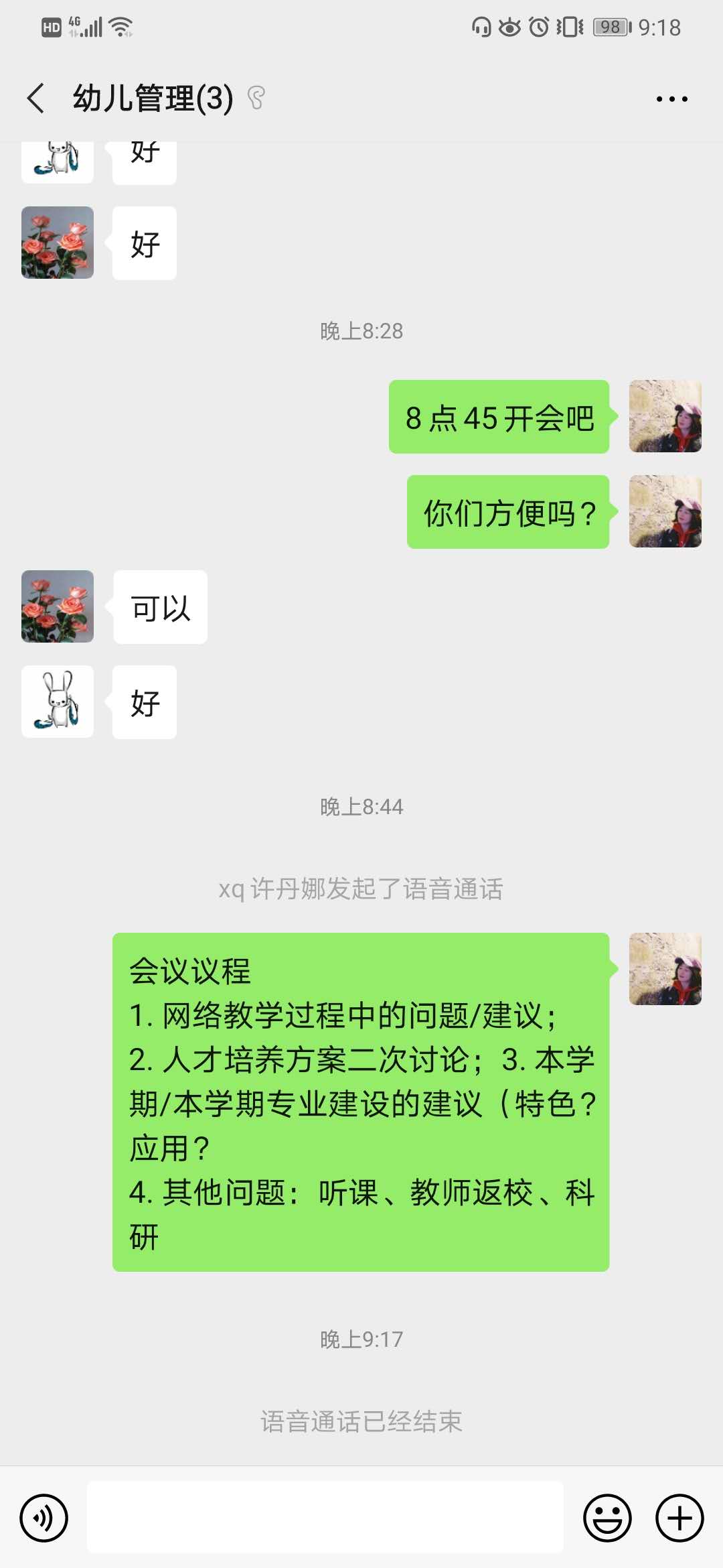 2020年4月8号晚上8点45分,针对幼儿管理专业的建设,幼儿教研组在微信群准时开始语音交流会, 会议由许丹娜老师主持。会议议程包括:网络教学过程中的问题/建议、人才培养方案二次讨论、本学期/本学期专业建设的建议。