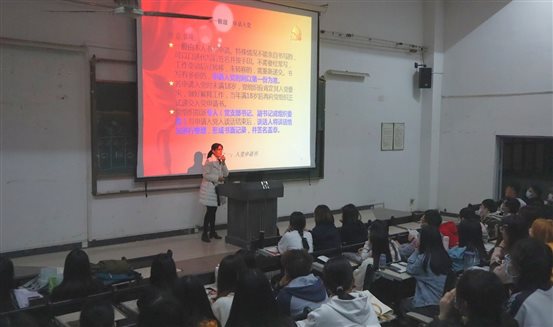 图为谢晓冲老师讲授《党的光辉历史、党的宗旨与性质》