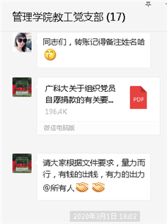 2月29日当日谢书记和两位委员商议之后,立即起草了《关于教工党员响应党中央号召,自愿为支持新冠肺炎疫情防控工作捐款的倡议书》这份倡议书。谢书记将此倡议书和相关想法向管理学院党总支刘静书记请示和汇报,并按照刘书记一些意见和建议来安排组织动员工作。3月1日谢书记将倡议书发到支委会,与两位委员交流意见。并安排组织委员王艳华老师负责草拟通知,并发布到党员微信息群;宣传委员陆源老师负责接收捐款并做好登记统计和按时向管理学院党总支刘书记汇报捐款活动进展。