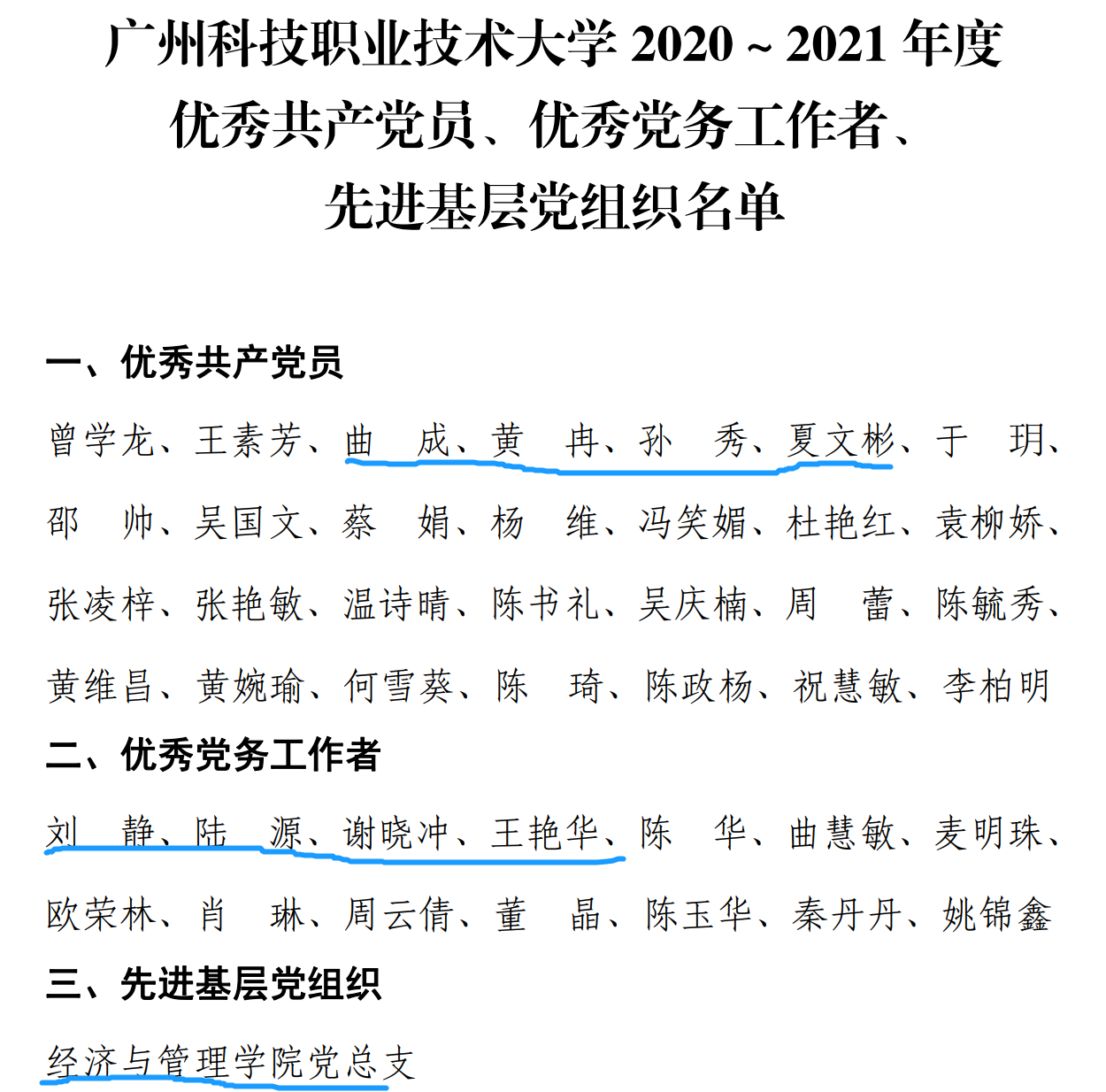 为表彰先进、树立典型,发挥共产党员先锋模范带头作用, 进一步增强基层党组织的凝聚力和战斗力,中共广科大党委决定,表彰我校优秀共产党员、优秀党务工作者和先进基层党组织。经济与管理学院党总支被授予“先进基层党组织”称号,曲成等4位同志被授予“优秀共产党员”称号,刘静等4位同志被授予“优秀党务工作者”称号。
