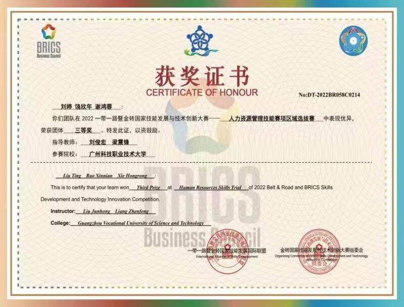 10月15日,21级人力资源管理专业学生刘婷、谢鸿蓉、饶欣年在参加2022第六届金砖国家技能发展与技术创新大赛人力资源管理技能赛项区域选拔赛中表现优异,荣获团体三等奖。指导老师为刘俊宏、梁震锋。