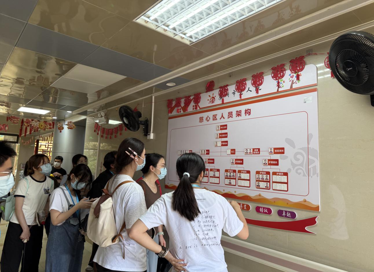 对接会议结束后,在老人院负责人的引导下,师生一行深入各园区进行实地参观。从配备适老化设施的居住区到开展书画、手工等活动的多功能厅,从绿意盎然的户外休闲区到提供专业护理服务的医疗区域,负责人详细介绍了老人院的运营模式、老人的日常照护流程及个性化需求。参观过程中,师生们主动与老人亲切交谈,倾听他们的人生经历与生活近况,现场氛围温馨而融洽。通过实地探访,师生们直观感受到老年人对情感陪伴、精神慰藉的迫切需求,进一步明确了志愿服务需以 “心贴心交流、实打实服务” 为导向的工作思路。