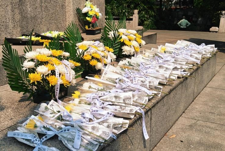 “请全体默哀一分钟!”在团学代表的主持下,团学成员们垂首肃立,手中紧握着鲜花,黑白衣襟在风中轻轻颤动,每一秒的静默都是对历史的铭记。五十余道身影如青铜雕塑般凝固。年轻学子们脖颈绷直,手中紧握住表达敬意的鲜花。此刻,个体的呼吸频率渐趋同步,凝聚成跨越时空的集体心跳。