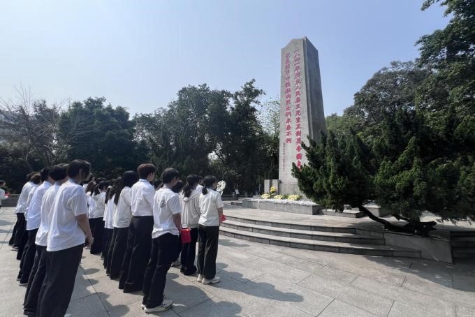 在三元里抗英斗争纪念碑前,团学成员们黑白身影与青灰色碑体相融,青年学子紧抿双唇、神情肃然,以无声誓言传承“天下兴亡,匹夫有责”的精神火种。