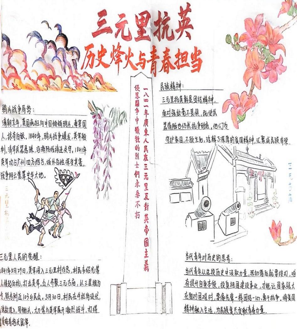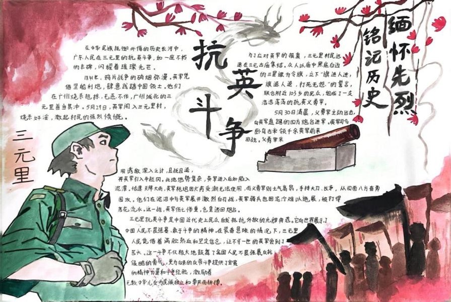 在缅怀活动开展之前,健康学院向大家发起了为三元里抗英斗争纪念制作手抄报的活动。各式各样的手抄报展现了健康学院的学子们对三元里抗英斗争的铭记,颜色交织绘画出线条边框,手抄报上呈现着学子们对三元里抗英斗争的致敬,他们用笔画描绘出历史场景,让我们透过画卷看到了历史的足迹。
