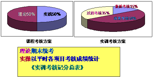 理论部分采用闭卷考试,按50%计,实操部分以平时考核成绩统计,按50%计。实操部分期末不统一考试,以平时各项目考核成绩计算,具体分值与考核项目参见《实训考核记分总表》。