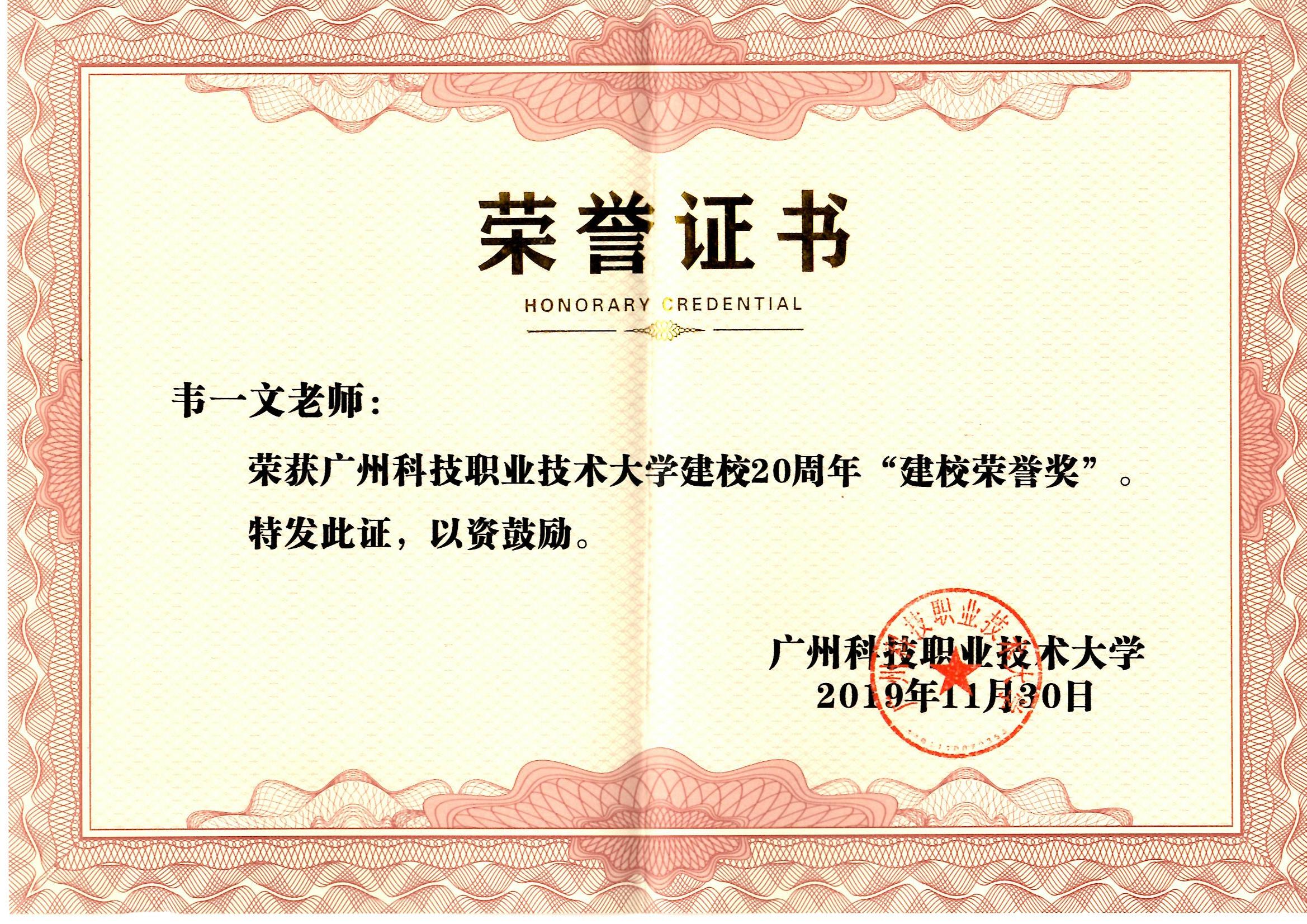 韦一文老师获得建校荣誉奖