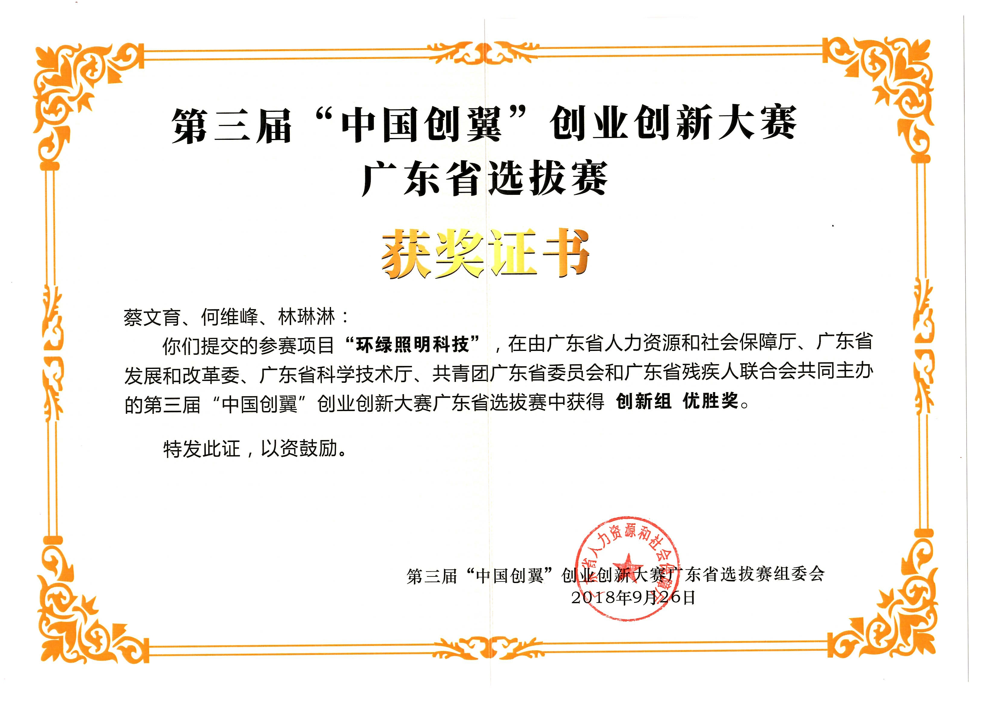 第三届中国创翼创新创业大赛广东省选拔赛创新组优胜奖