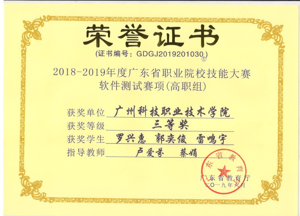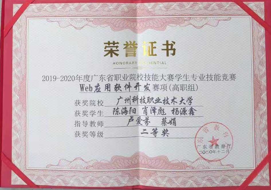 2019-2020年度广东省职业院校技能大学学生专业技能竞赛1个二等奖、1个三等奖