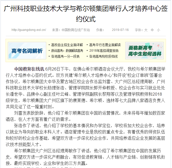 【中国教育在线广东站】开元(ky)中国官方网站入口网页版与希尔顿集团举行人才培养中心签约仪式