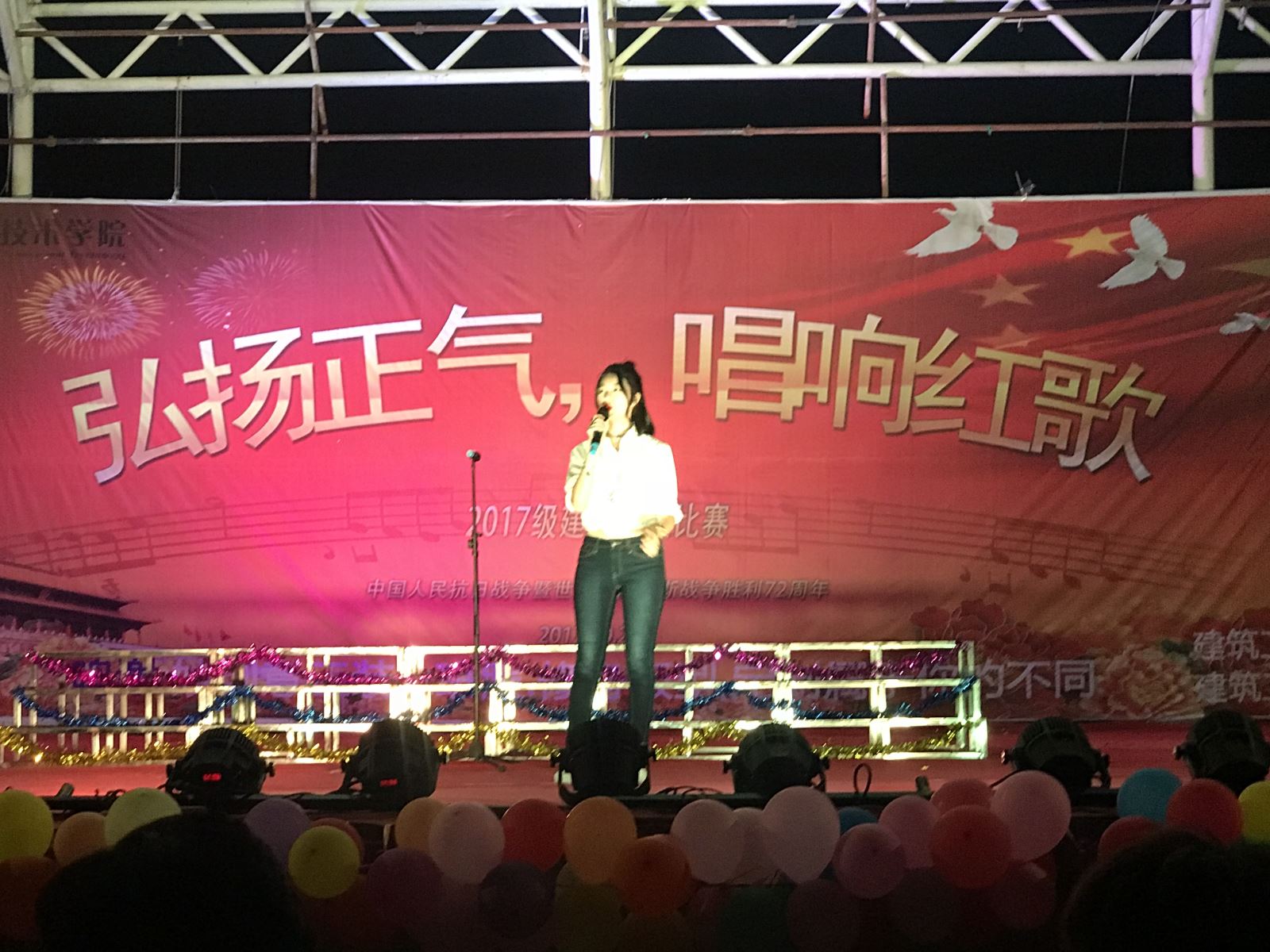 2017年10月25日晚上7:00,红歌比赛正式拉开序幕,建筑工程学院2017级十个班级的学生陆续上台演唱,唱响了《中国军魂》、《中国人民解放军军歌》、《红旗飘飘》等充满热血和激情的歌曲。台上的同学昂首挺胸,唱出对祖国的自豪与骄傲。台下的观众也被同学们的歌声感染,轻声唱和并摇动手中的灯光为台上的同学加油。