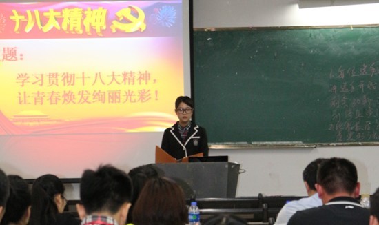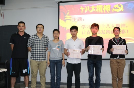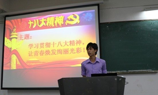 2013年4月25日晚7点30分,以“学习贯彻十八大精神,让青春焕发绚丽光彩”为主题的党的十八大精神演讲比赛在课室5306举行。