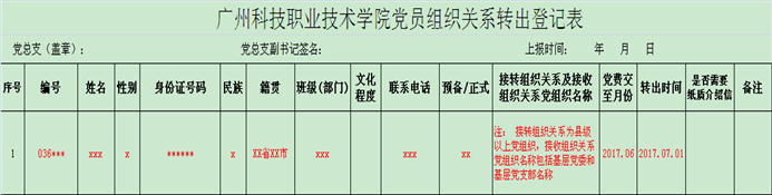 例如:中共广东省××市××区委组织部转××镇××社区党支部(注: 接转组织关系为县级及县级以上党组织,接收组织关系党组织名称包括基层党委和基层党支部名称)