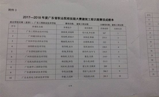 2017年12月22日到12月23日,2017-2018年度广东省职业院校技能大赛(高职组)建筑工程识图大赛在广东工程职业技术学院举行。我院选派的由温倩慧老师领队,董晶老师、吴燕老师指导的16造价设计2班林海槟、16建筑设计1班吴其昌两位同学组成的参赛代表队在来自全省各高职院校的38支队伍的76名学生中,经过激烈的角逐,荣获二等奖,全省排名第6名的佳绩。