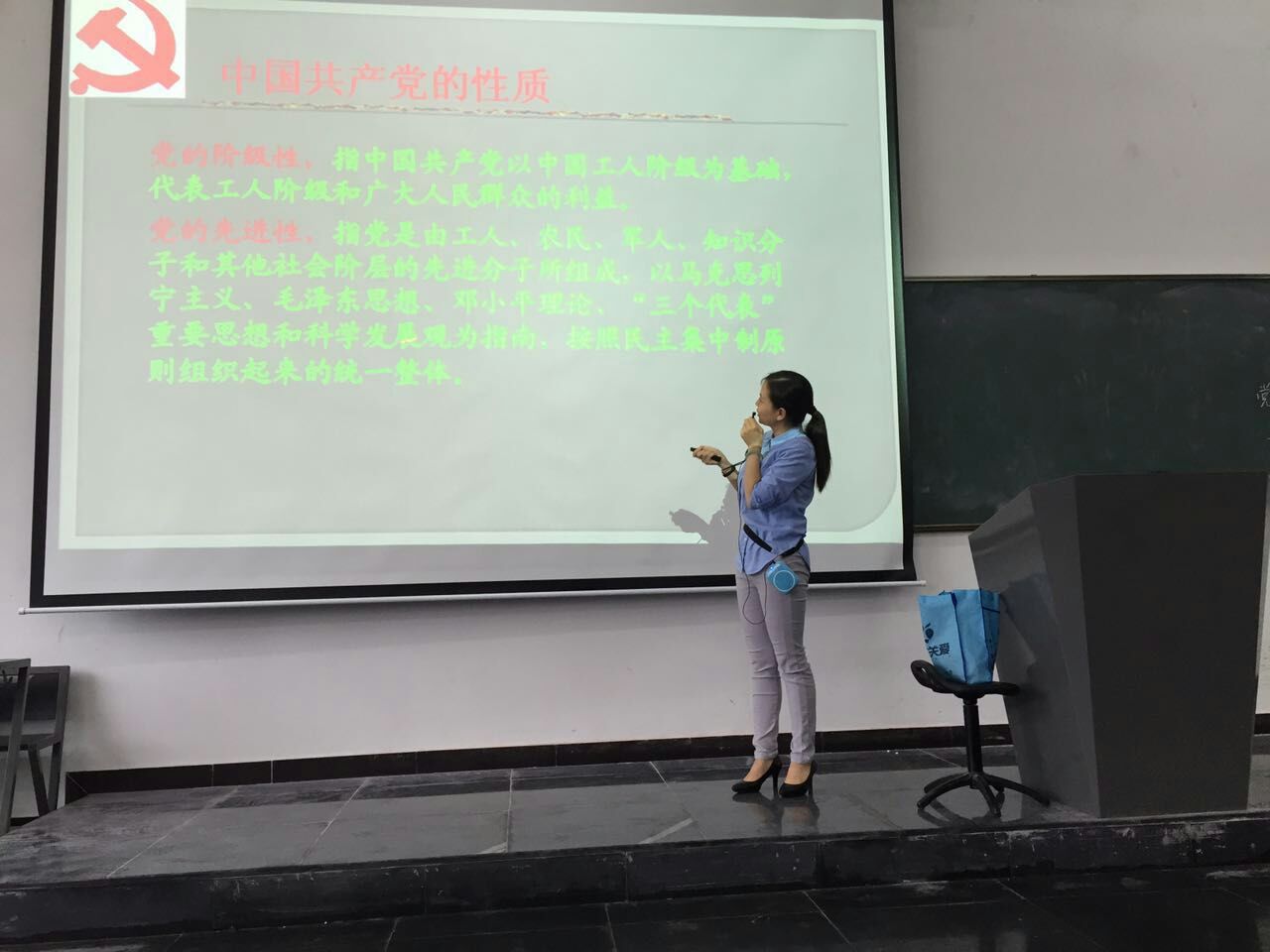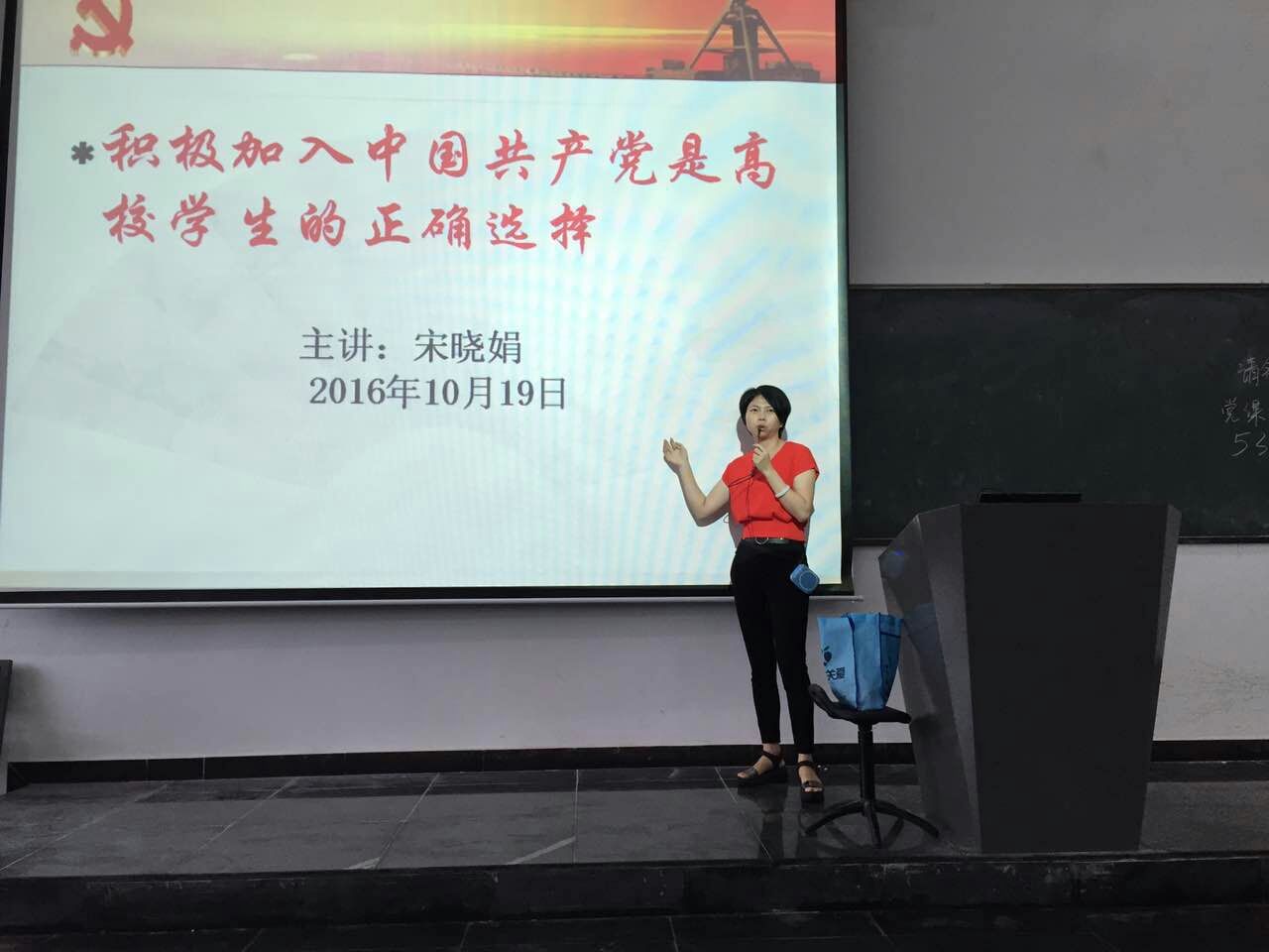 20161019日下午两点至五点半,建筑工程学院第九期初级党课培训班在3201阶梯教室举行。本次初级党课培训班共有189名学生参加,其中164名为大一新生,25名为大二学生。主要内容共四个专题,分别是:(一)积极加入中国共产党是高校学生的正确选择;(二)入党的手续和程序;(三)中国共产党的性质和宗旨;(四)党的光辉历程。其中专题(一)和(二)由宋晓娟老师主讲,专题(三)和(四)由李静老师主讲。经过4个学时的培训,学生们对党组织有了更深一步的认识,更加坚定了他们要加入中国共产党的决心。