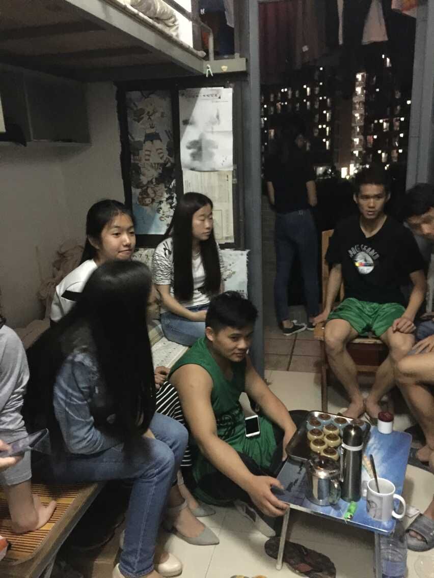 4月23日晚八点,辅导员李静老师和几名学生干部到学生公寓走访学生宿舍。本次走访的宿舍主要是14级建筑造价8班学生宿舍。辅导员李静老师在几名班委的陪同下到宿舍了解学生情况,从走访的过程中可以看出,学生状态良好,十分热情,而且宿舍整洁、干净。走访最后一间宿舍时,学生们已经泡好茶等待辅导员的到来。学生们其乐融融,主动和辅导员拉家常,辅导员在聊天的过程中向学生强调要注意个人财产安全和人身安全,按时作息,舍友之间要和谐相处。一直到晚上十点多,辅导员才离开宿舍。学生向辅导员展示茶具学生们正在泡茶