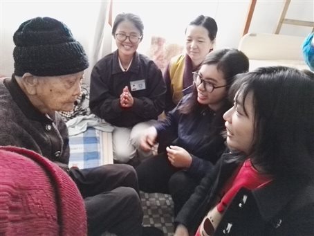 图为两名我院实践部志愿者怀着自己的爱心唱了一首《感恩的心》,并比划着《感恩的心》歌曲的手语,感动了久卧在床上的百岁老人。这位百岁老人自己精神抖擞地坐起来,开开心心地和志愿者合唱。