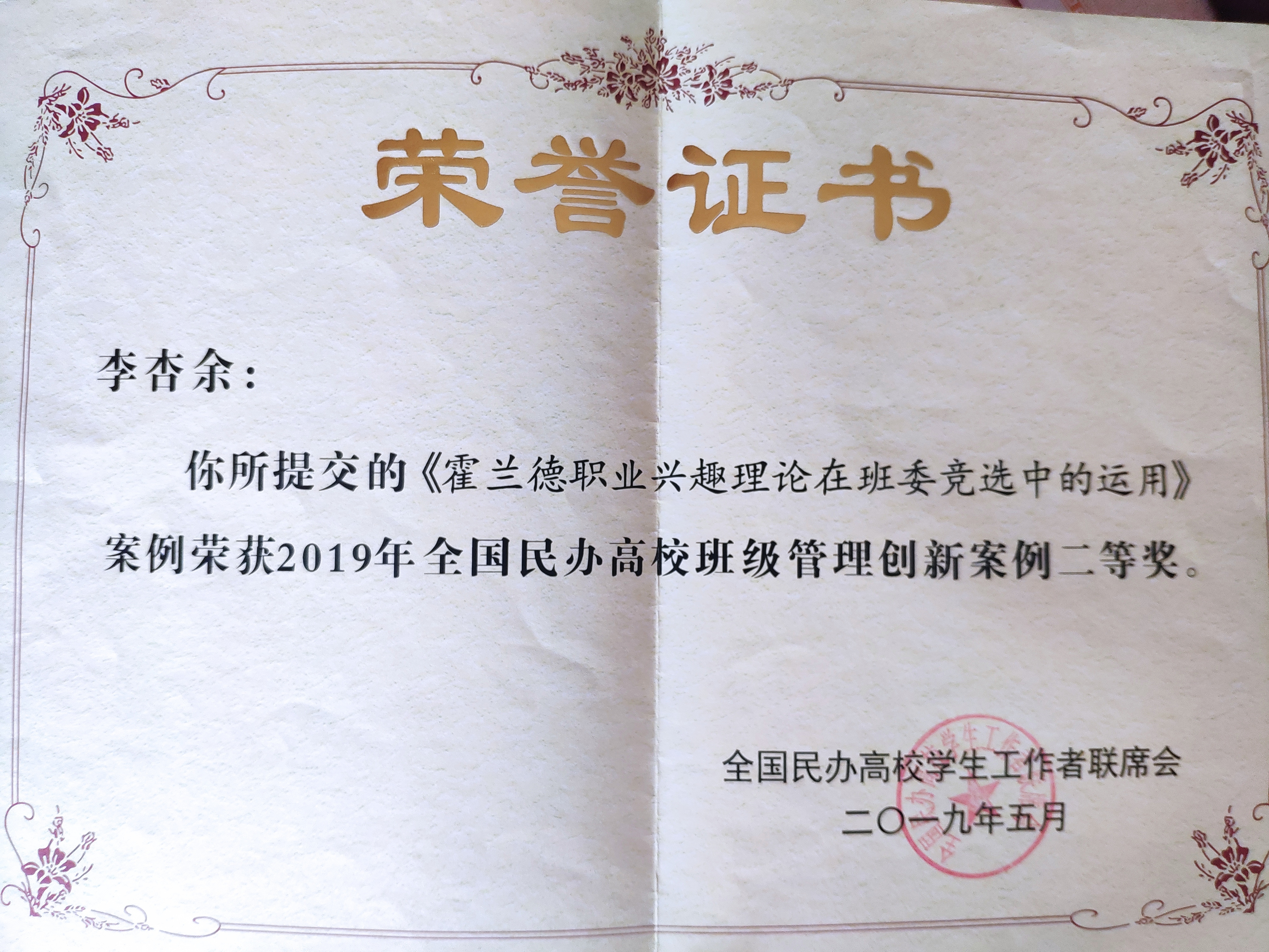下一篇: 李杏余 教育部职业院校文化素质教育指导委员会主办的全国职业院校校园文化建设高峰论坛中,获得“三等奖”