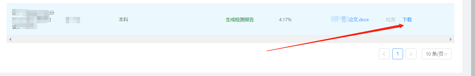 等待一段时间之后,可以看到相应的论文列表中“操作”列下方出现“下载”按钮,点击即可下载检测报告。