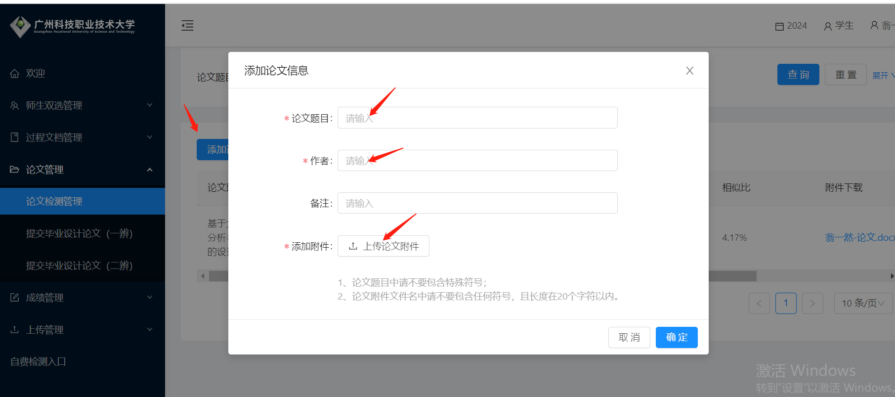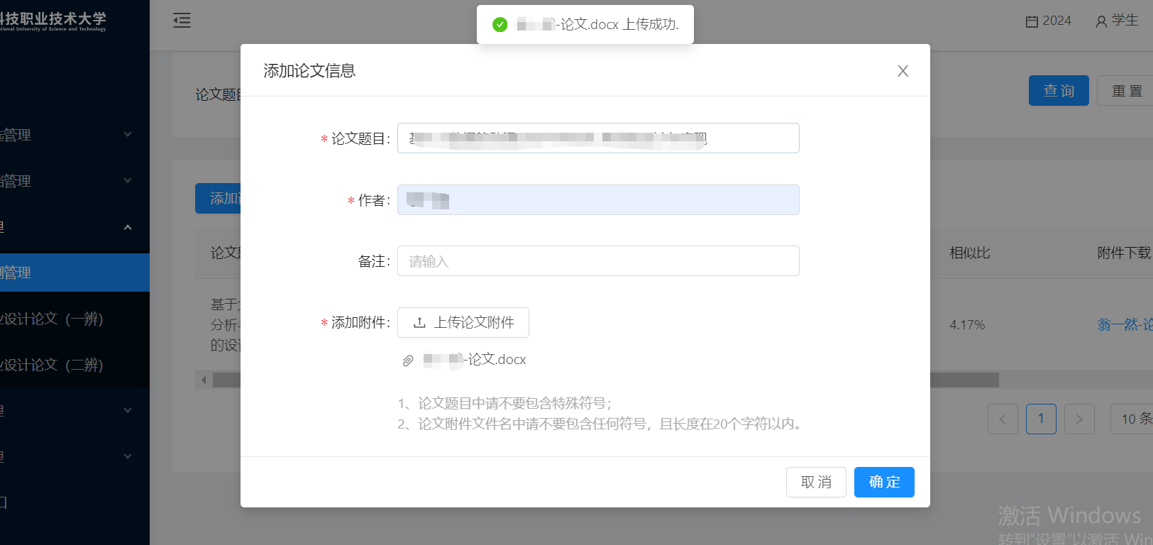 点击“添加论文信息”按钮,填写相应的论文信息并上传论文文档。点击“确定”按钮,确认提交。