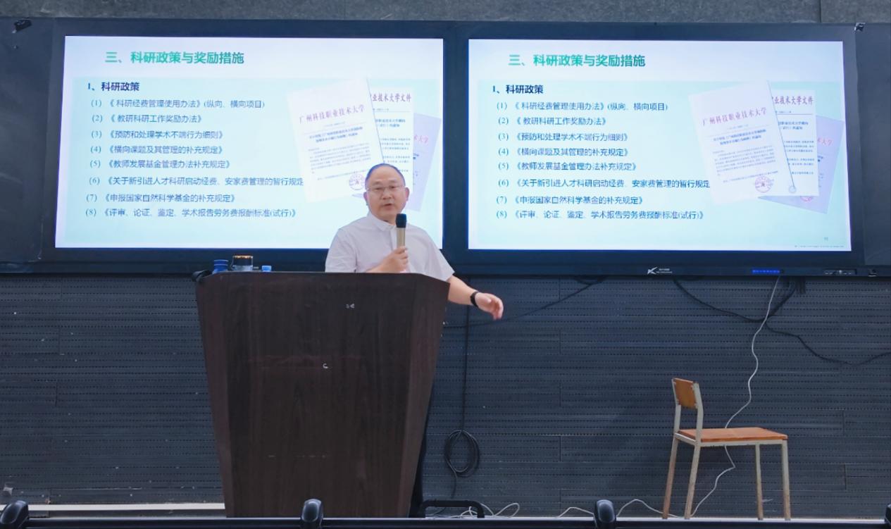 科研处处长吴福根教授作《科研制度专题讲座》,从科研处的主要职责与工作情况、现行科研政策与奖励以及科研工作几个重要时间节点进行介绍和讲解,并对新教职工如何搞好科研工作提出几点建议。