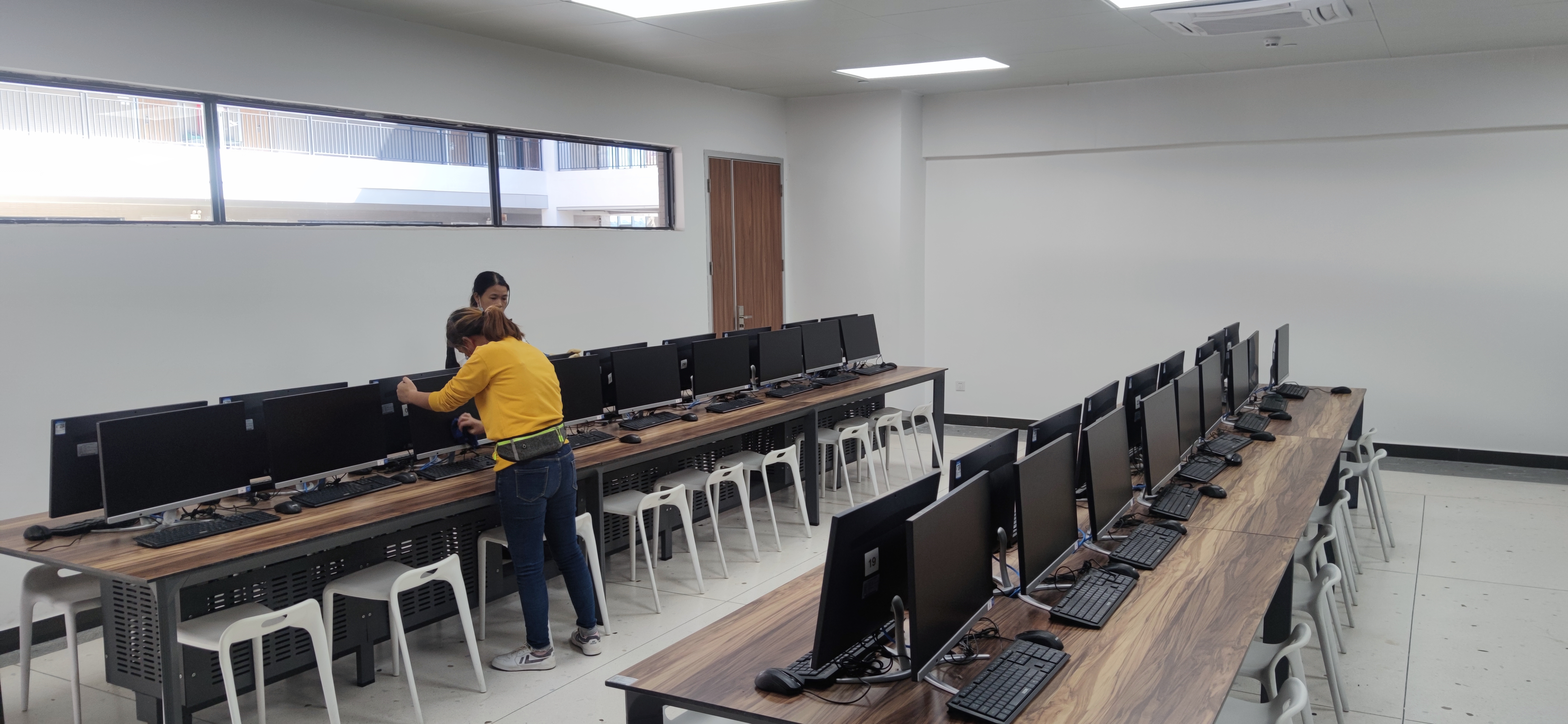 由于滨海校区的特殊地理天气条件,靠海且大风,同时扬尘严重。因此,为了给广大师生营造良好的实验(训)教学环境,滨海校区实训中心组织同学们对机房进行了全面卫生清洁工作,整理实训仪器设备。同时,联系后勤服务中心的清洁班对机房进行了清洁消毒工作。