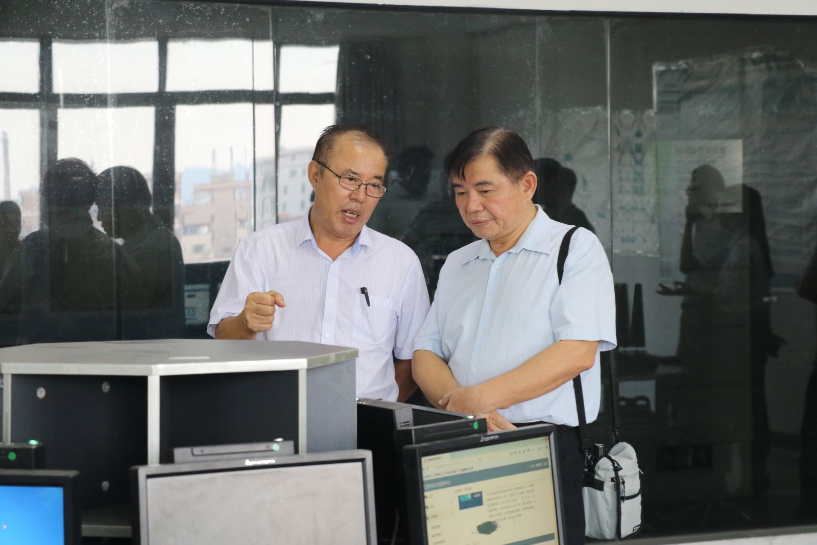 图为:陈政石教授向广东省计算机学会领导介绍实训设备