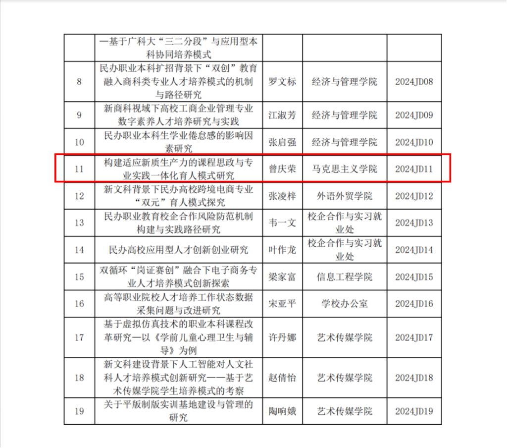 课题研究是教师专业提升的重要途径,是教师职业发展的必经之路,更是学校提高教育教学质量的强力保障。近日,2024年度广东省教育研究院民办教育研究基地与校级科研项目的立项名单公布了,我院曾庆荣老师与赵天惠老师成功立项!其中,曾庆荣老师成功申报2024年度广东省教育研究院民办教育研究基地项目,赵天惠老师成功申报2024年度校级项目。