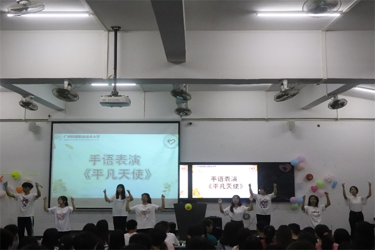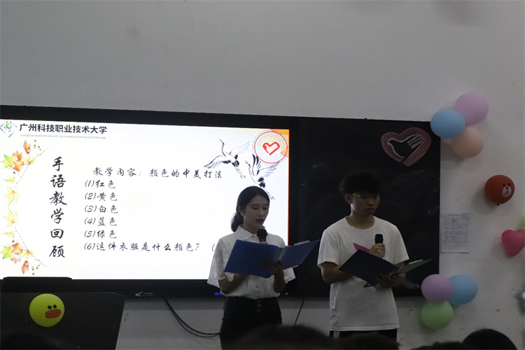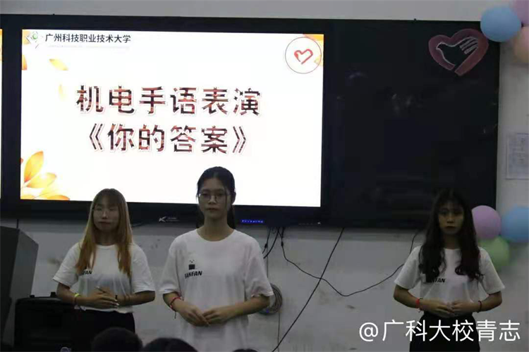 活动开始,手语队给我们带来《平凡天使》手语表演为开场曲,接着一起学习关于”颜色”的手语教学,广东机电职业技术学院青协的手语队也给我们带来《你的答案》手语表演。紧随着还有各种小游戏于、手语的教学以及表演等。