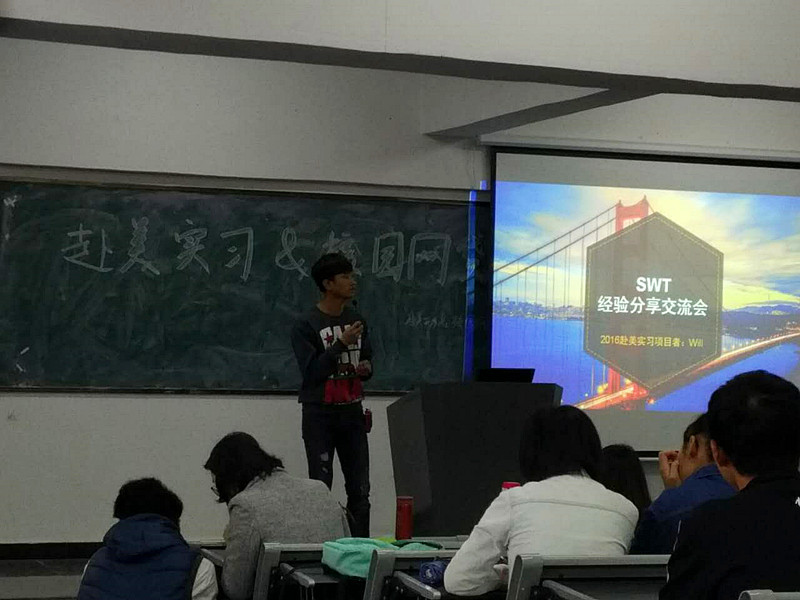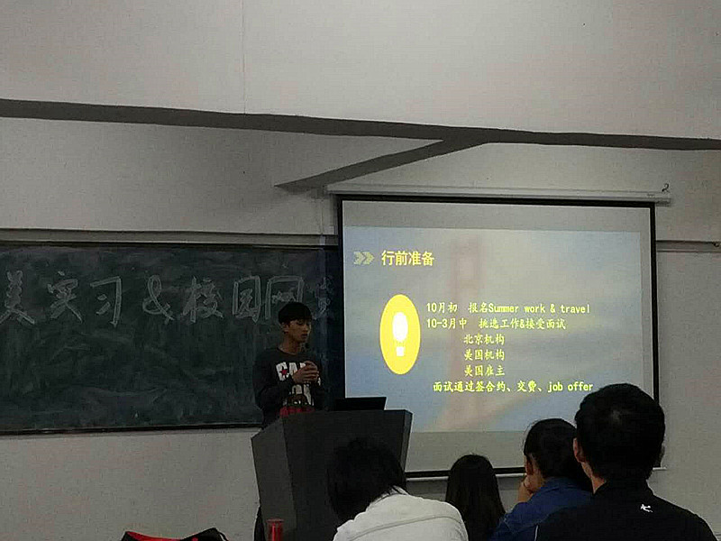 江武师兄认真地向同学们介绍赴美带薪实习项目,通过图片跟同学们讲解出发前的准备,让同学们更加深入地了解这个项目并开解同学们心中的疑惑。展示自己在IOWA 州 OKOBOJI唯一的麦当劳中全英文的环境里当服务员以及工作之余到处旅游的照片给同学们,让同学们真切地体验了一次完美的赴美带薪实习之旅。