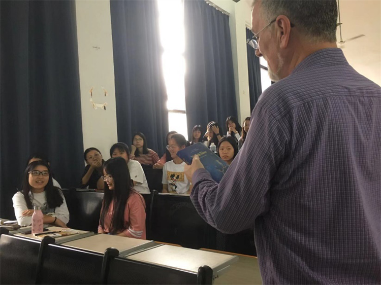 11月,英国剑桥大学Peter Fearon博士受邀为我院大一、大二学生提供了主题为“全球贸易和商业变化”的系列讲座,并在红石咖啡厅举行了“英语文化交流”小型座谈会。