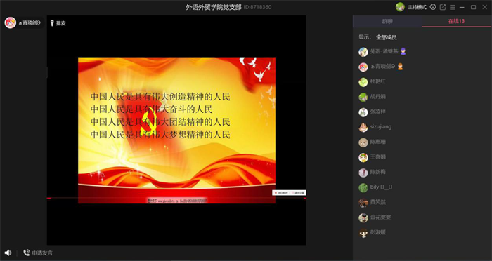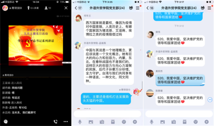 散会后,党员们讨论的热情不减,继续在支部群里发表自己的看法和意见。在520这个特殊的日子里,外语外贸学院教工支部全体党员在支部群这个大家庭里表达了自己对党和国家的拳拳赤子之心。