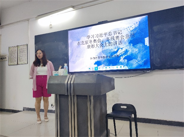 5月11日,外语外贸学院学生党支部组织全体在校党员深入学习习近平总书记在北京冬奥会、冬残奥会总结表彰大会上的讲话,深刻领会北京冬奥精神内涵。本次会议由陈琪同志主持,她首先展示了几张照片,带领党员同志们回顾冬奥上中国健儿们的精彩瞬间,引起同志们的讨论;其次,全体党员从习近平总书记的讲话中学习本次奥运会获得的几点收获和取得这些成绩的原因;重点介绍和学习 “胸怀大局、自信开放、迎难而上、追求卓越、共创未来”的北京冬奥精神;最后,点出“圆梦冬奥会,一起向未来”的主题,号召全体党员“更加紧密地团结在党中央周围,发扬北京冬奥精神,以更加坚定的自信、更加坚决的勇气,向着实现第二个百年奋斗目标奋勇前进,向着实现中华民族伟大复兴的中国梦奋勇前进!”