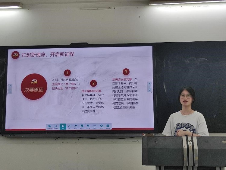 梁珊同学在讲解“中国共产党为什么能”时从三个主要原因和三个次要原因分析了中国共产党从站起来、富起来到强起来的历程。中国共产党的成功是历史的选择,是科学理论的指导,是人民群众的支持,三者缺一不可。