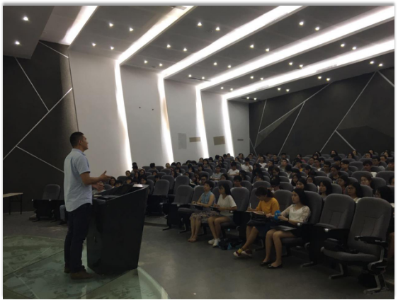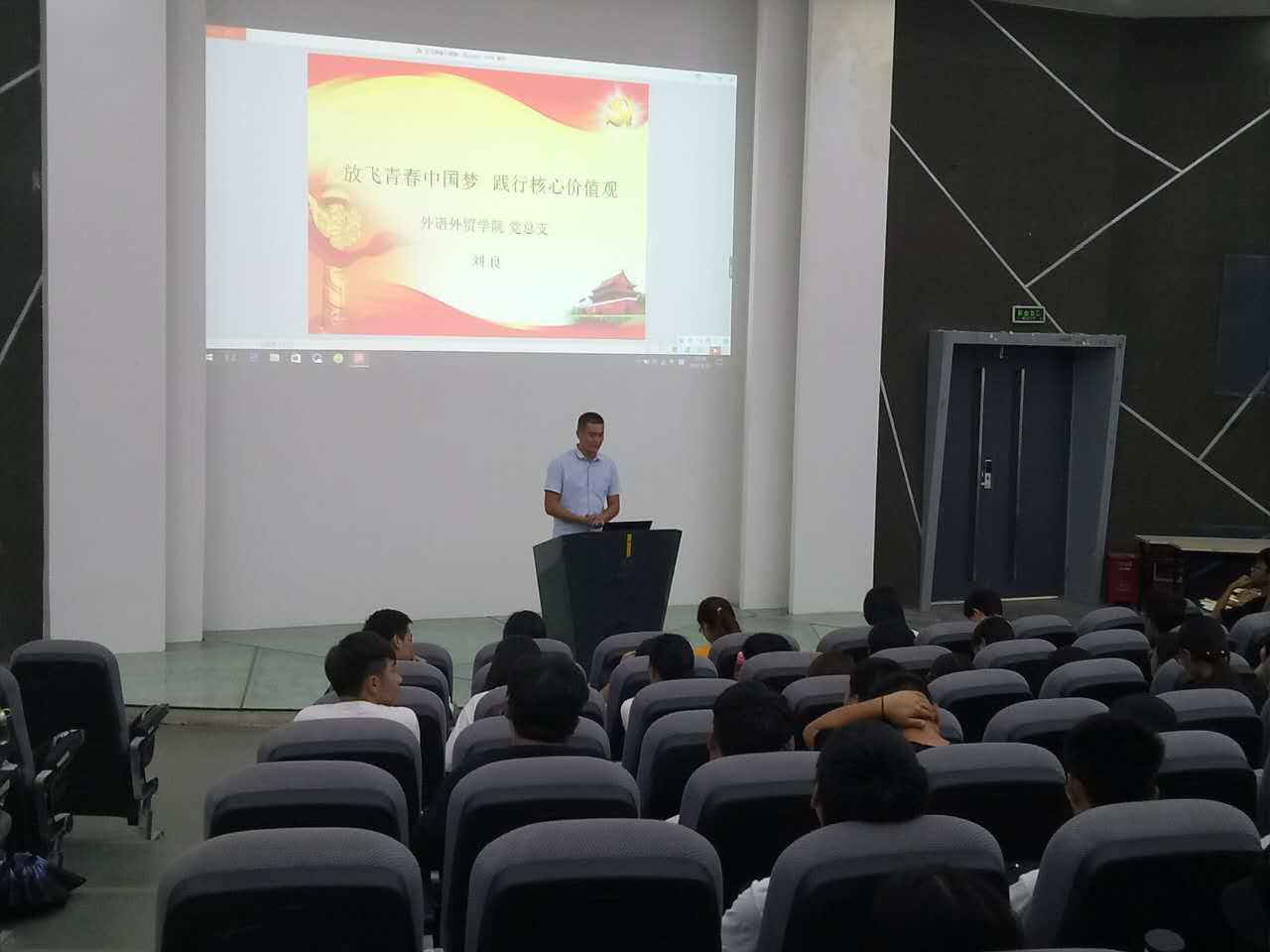 为引导广大学生了解社会主义核心价值观的内容和实践的要求,在思想上认同,在学习生活中遵循践行,使社会主义核心价值观融入每一个学生的思想意识、并用于学习生活之中。外语外贸学院于2017年9月27日下午14点在图书馆一体化展示厅由党总支的刘良书记举办了以“放飞青春中国梦 践行核心价值观”为主题的学习报告。内容共分为五个部分。出席的有教工党员老师,2016级的入党积极份子、党员和2017级的全体新生,共计190人。