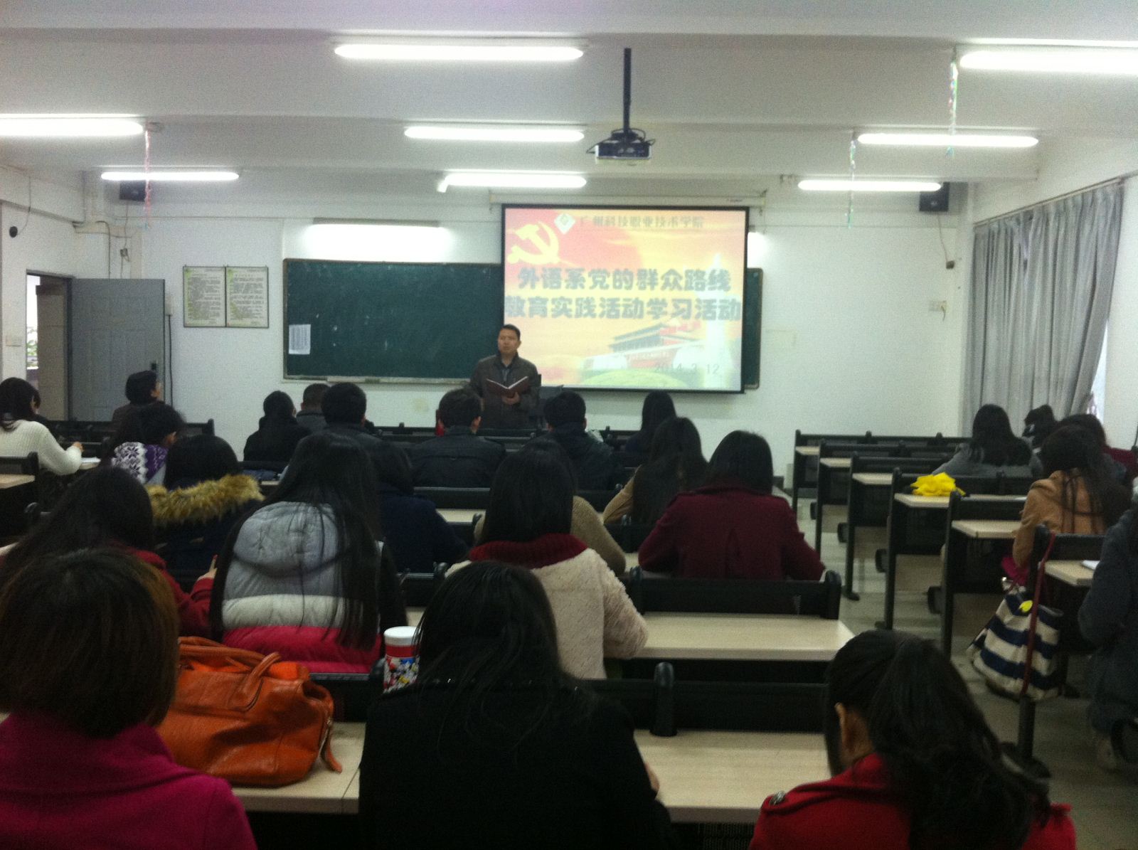 为扎实开展好党的群众路线教育实践活动,确保系部党建工作顺利有序的进行,3月12日下午3点,外语系党小组在1203教室举行的教育实践活动集中学习。会议由系部党支部书记邱健主持,在校的全体党员、预备党员,入党积极分子均参加了此次会议。