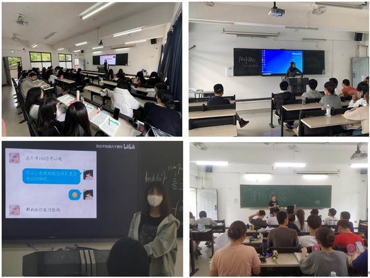 辅导员老师首先通过PPT向同学们介绍了常见的诈骗手段。比如:通过微信朋友圈、微博私信等平台,诱导学生参加抽奖活动、充值返利活动等;利用手机短信发送虚假消费提示或中奖提示,或者诱骗客户拨打假冒的银行服务电话、银联信用卡管理中心、公安部门等部门的咨询电话,套取客户的银行卡、密码等信息进行诈骗;还有冒充公检法人员、辅导员老师等进行诈骗;除此之外,游戏充值、快递理赔、网上交友、签订虚假公司合同、高价购买辅导课程或者高利息放款等,这些都是学生们容易上当受骗的诈骗方式。并且提醒同学们,不要认为“我没钱,就不会被骗”,因为骗子会诱导学生去一些常用网络平台上进行借贷,所以任何一个人都不能掉以轻心。