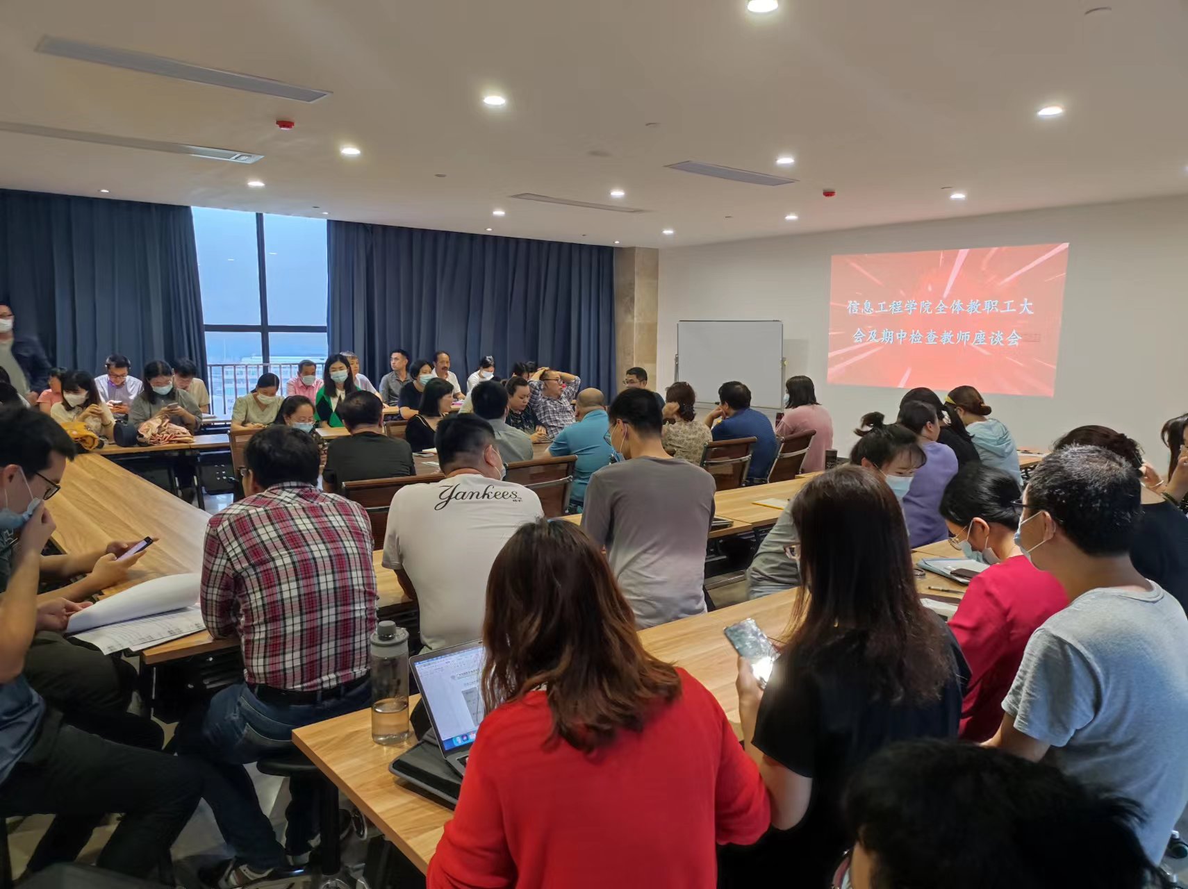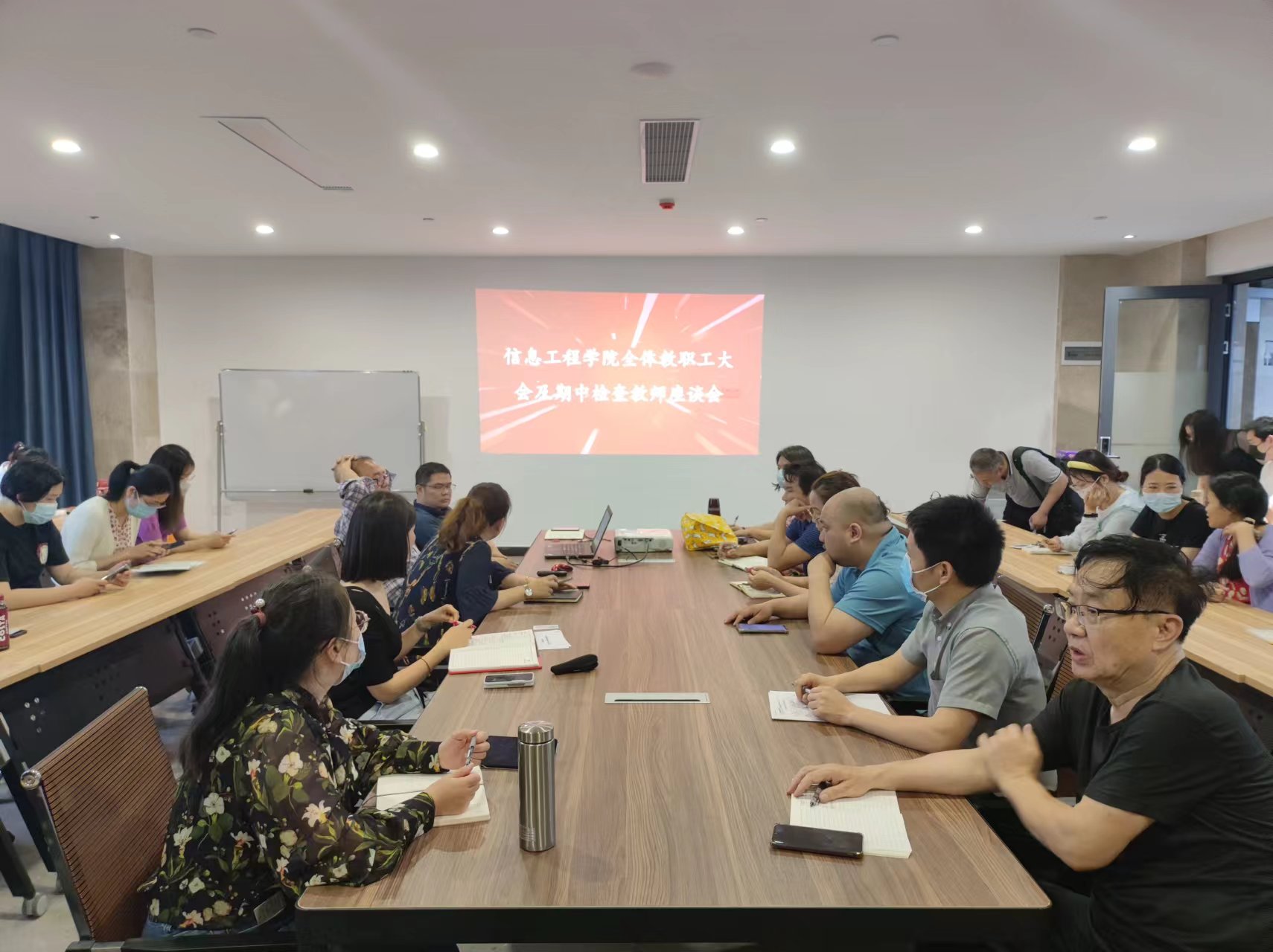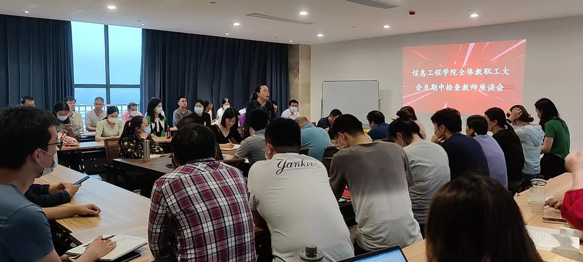 为稳步推进学位评估及期中检查工作, 5月11日下午2点,信息工程学院召集全体教职工召开全体教职工大会及期中检查教师座谈会,本次会议在81504举行。