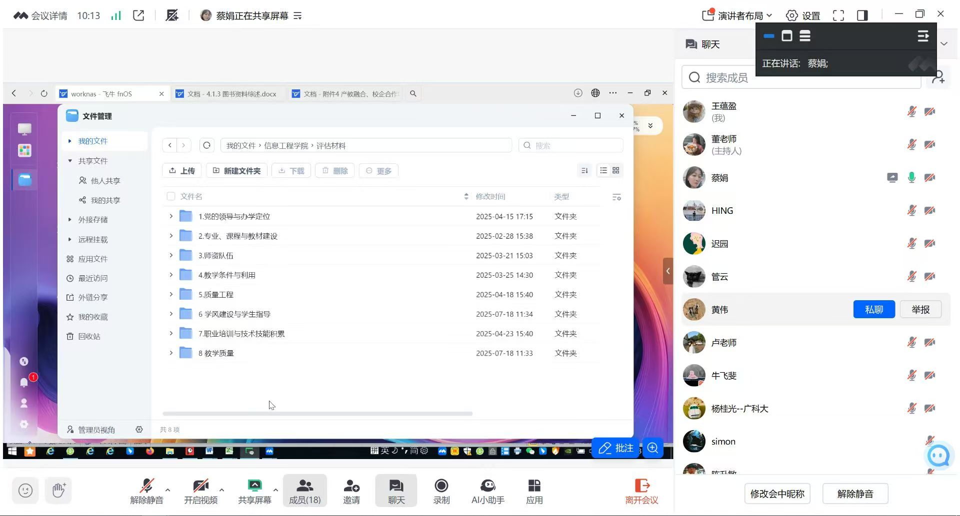 董艺副院长随后进行发言。第一,确认上周评估任务落实情况。她首先对上周会议部署的评估任务完成情况进行了逐项核查与通报,要求相关责任人确保任务闭环、质量达标。第二,点明本周评估核心任务。明确了本周评估工作的核心攻坚方向,即集中力量完成评估指标2.1.2和2.2.1的材料整理与佐证工作。第三,协调实践环节资源。需同步确认毕业设计与岗位实习的学生人数分配方案,确保指导教师配备科学合理,满足实践教学需求。