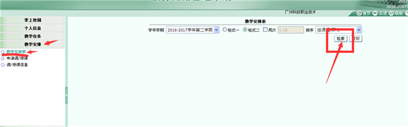 查看课表安排:登入教务系统后,点击屏幕左边的“教学安排”下拉菜单的“教学安排表”,然后点击右边“检索”即可以查看本学期的课表安排。