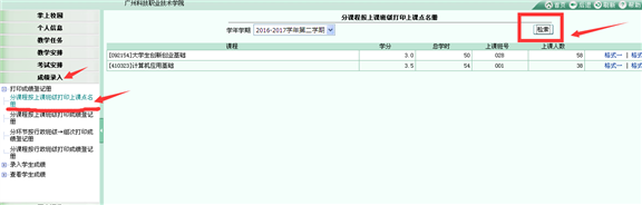 打印学生点名册:登入教务系统后,点击屏幕左边的“成绩录入”下拉菜单的“打印成绩登记表”下的“分课程按上课班级打印上课点名册”,然后点击右边“检索”即可以查看本学期上课学生的名单。