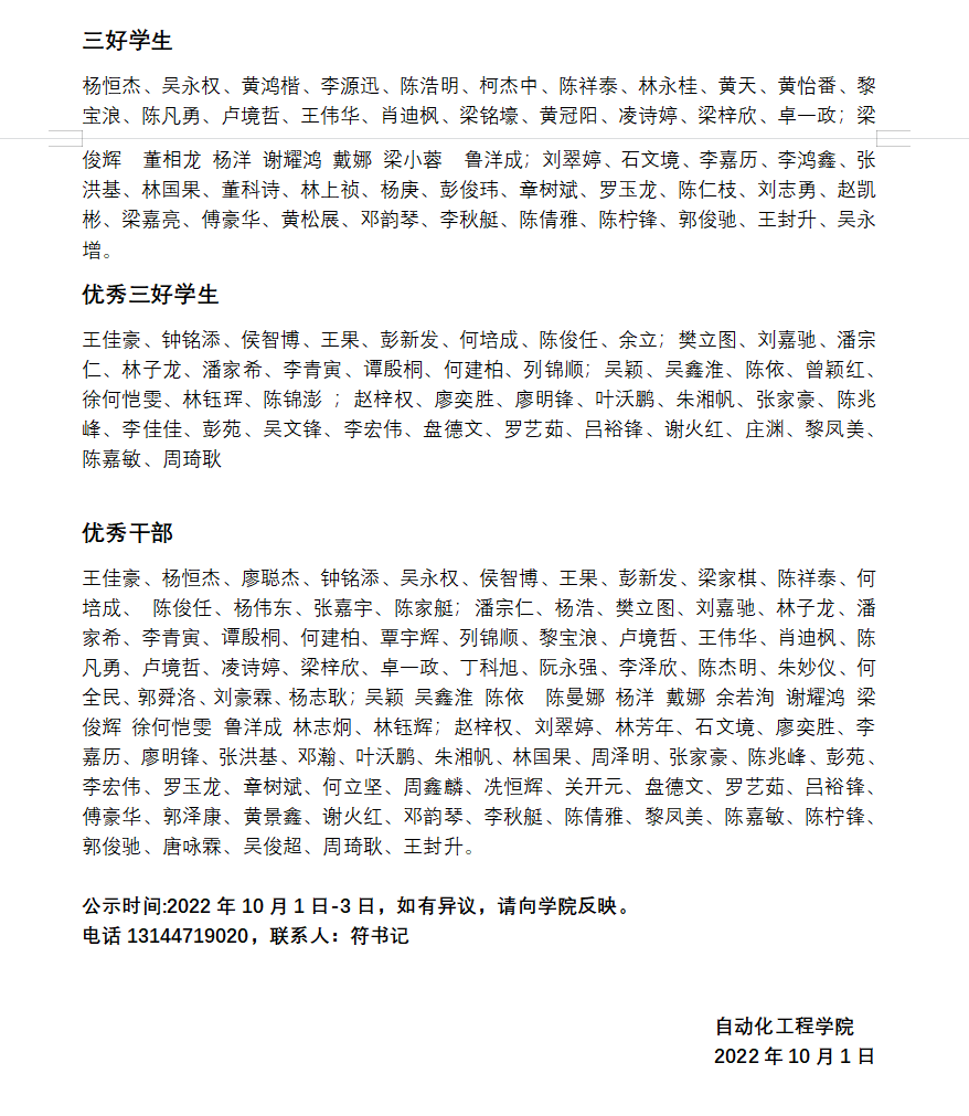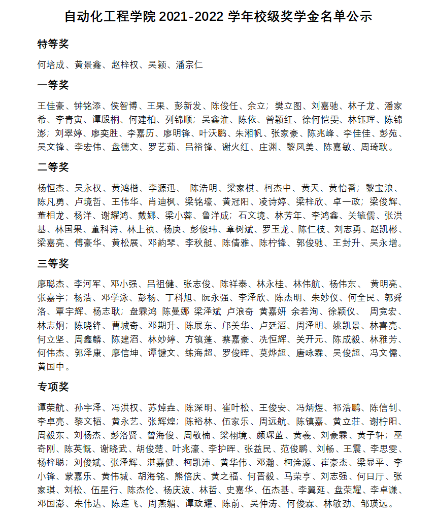 关于自动化工程学院2021-2022学年校级奖学金名单公示