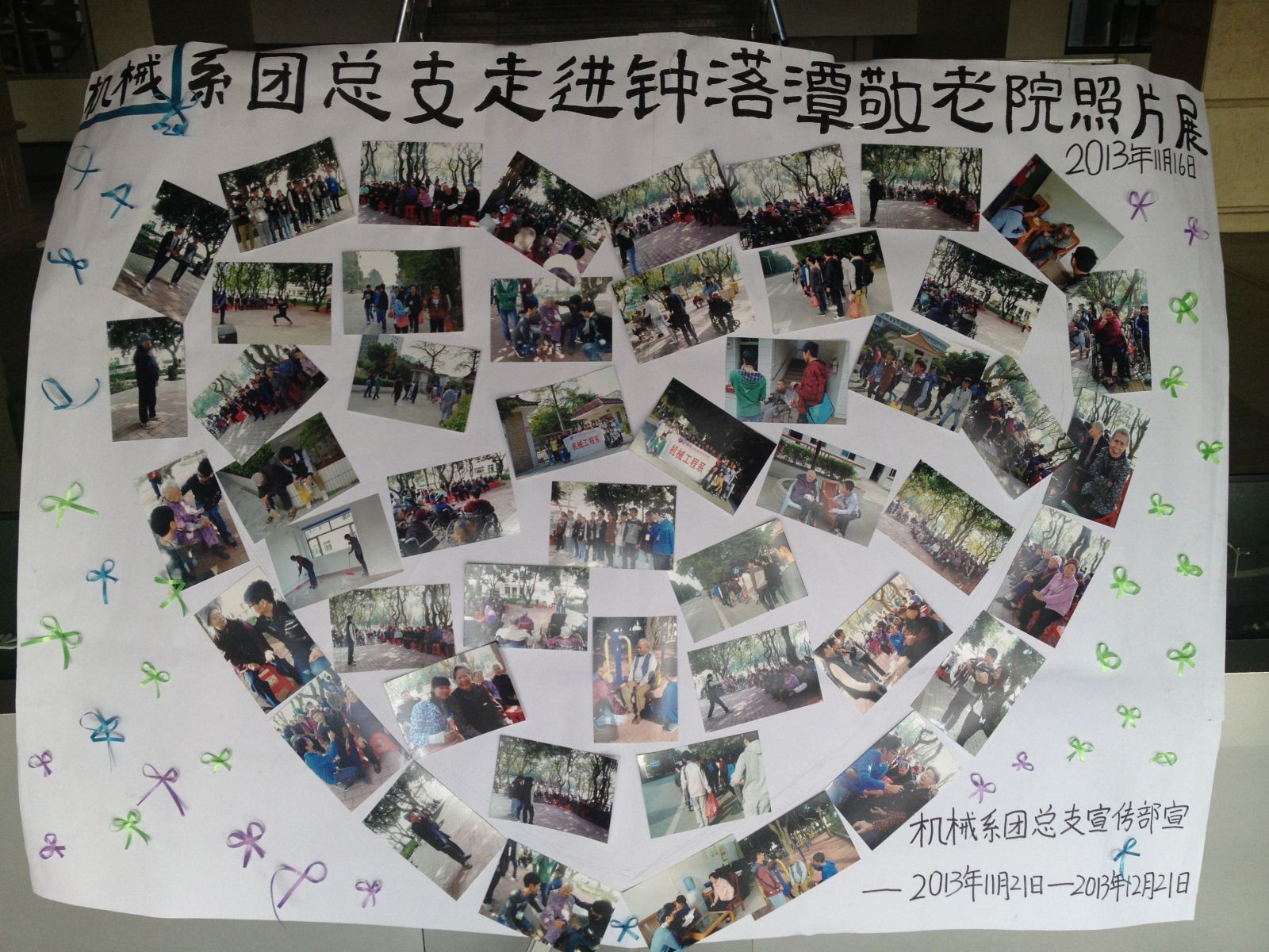 11月21日,学院二楼大厅,一张彩色的相片墙异常吸引眼球:“一颗由图片拼贴而成的爱心”,这是我系团总支上周走进钟落潭敬老院的图片展。本次图片展主要为宣传当代大学生的爱心精神,叮嘱大学生应时刻以善良的心态对待生活,关爱社会中的弱势群体。